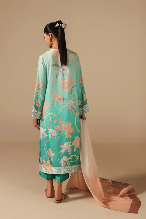 Radiating freshness and refined elegance, this AMMARA KHAN ensemble features a long, turquoise shirt with a floral print in pastel tones. The front and neckline is hand-embellished with crystals, sequins, and bead work, and the sleeves end in embellished cuffs. The shirt is paired with matching printed pants and a pot-dyed blush-toned dupatta with tonal borders, making it ideal for festive and formal Eid occasions.