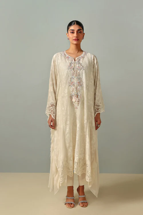 Rendered in a soft ivory palette, this kaftan set features a long, loose-cut top crafted from a self-textured fabric, paired with plain straight pants. The shirt is adorned with hand-embellished floral accents along the neckline, detailed with pearls, sequins, and resham beadwork, and finished with lace-cut tassels. The hemline and sleeves are completed with delicate embroidered scalloped edges, while the front is accentuated with intricate lace and raw-edged frayed detailing—perfect for a daytime Eid look.