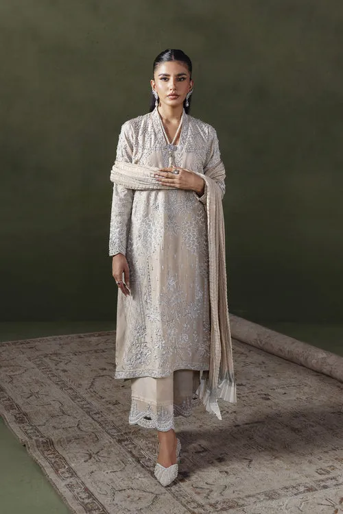 Exuding refined elegance, this ivory 3-piece formal ensemble is crafted to perfection for your most special occasions. The shirt features exquisite hand embellishments, rich in resham intricately detailed with shimmering beadwork and sequins that adorn the neckline, sleeves, and front, creating a luxurious play of texture with every movement. Paired with flared pants, the design is elevated through a delicately embellished border that adds subtle glamour while maintaining a graceful silhouette. A beautifully crushed dupatta completes the set, bringing an ethereal finish with its soft texture and effortless drape.