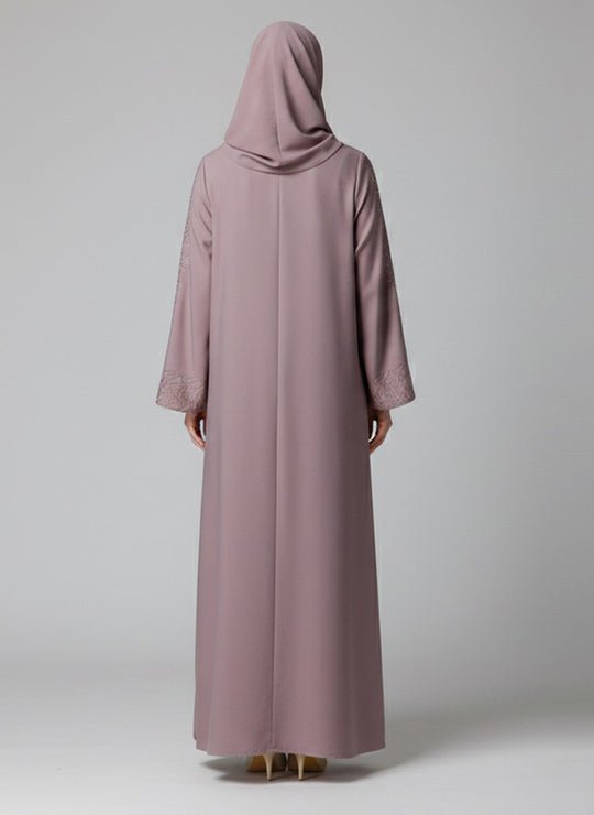 Introducing the elegant Arabis Front Open Abaya in a unique Dusty Pink/Mauve color. Crafted from premium, flowing Nida fabric, the design is perfected with intricate geometric stone work on the wide…