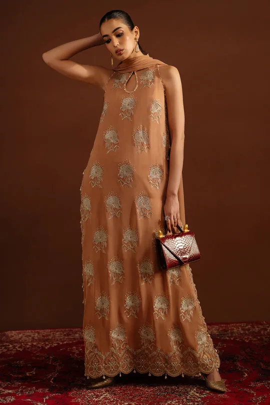 A vision of understated luxury in warm rose-peach, adorned with delicate gold florals that softly shimmer. Effortless elegance flows from a minimalist neckline to an ornate hemline, perfect for evenings of quiet opulence.