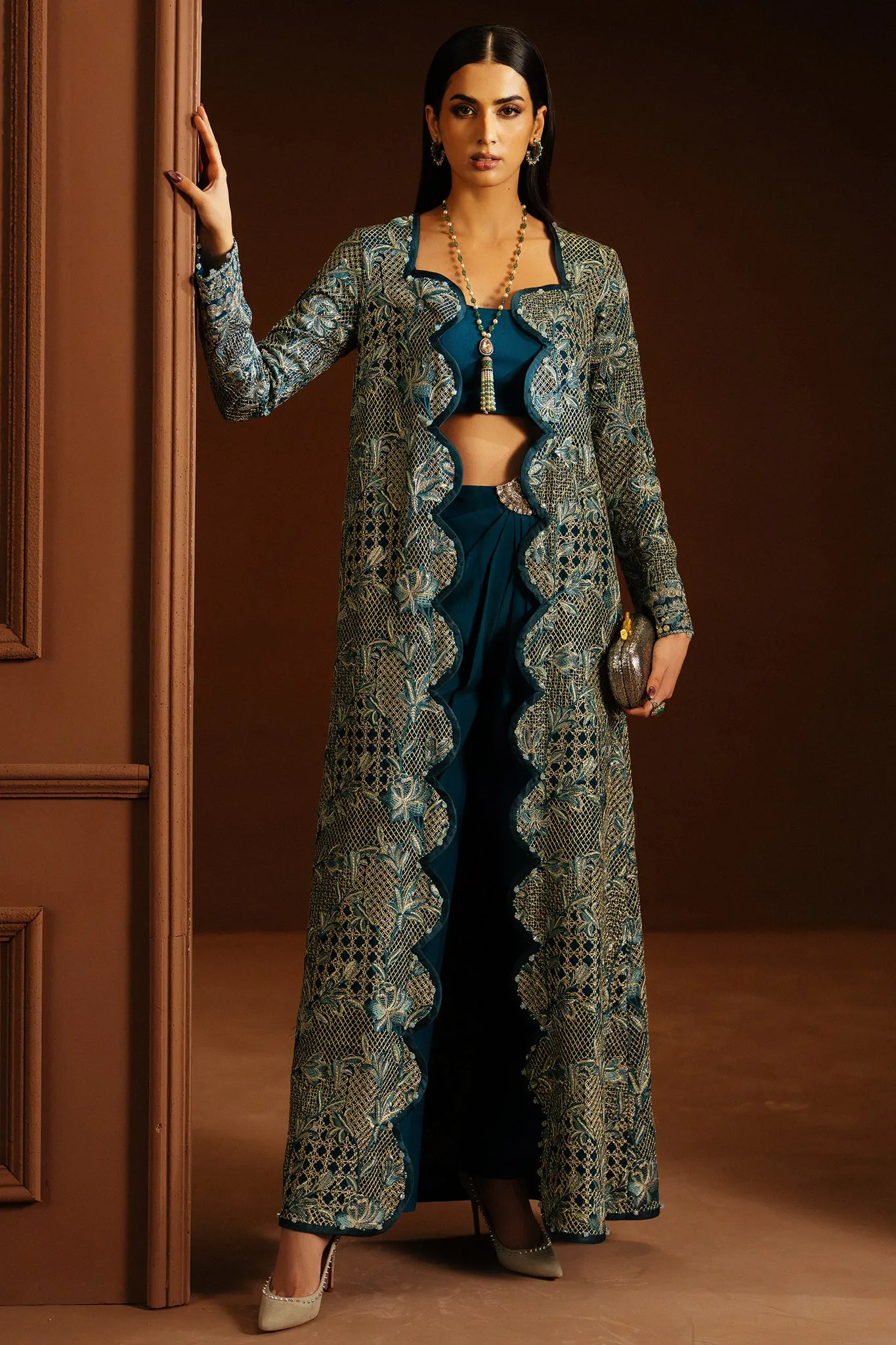 A luminous ode to modern elegance, Voile d’Émeraude unfolds in a deep emerald hue, radiant against the skin. The sculpted inner silhouette is complemented by a statement long jacket, adorned with antique gold embroidery that glimmers with every movement. Scalloped edges trace the front with architectural precision, a testament to masterful artisanal craftsmanship.