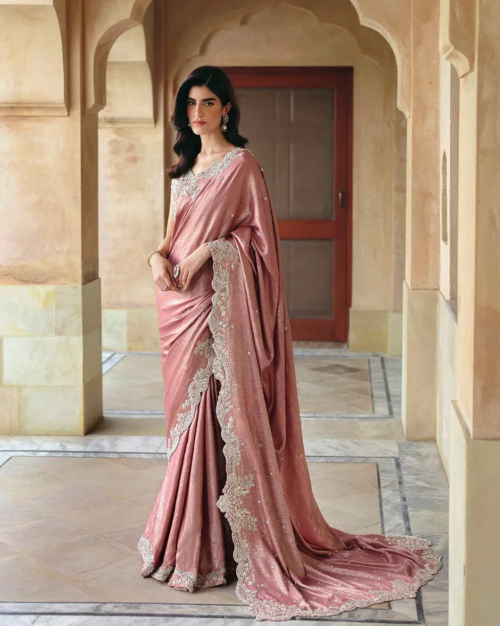 Description:Â Encapsulating elegance, Jahari captivates with its timeless silhouette. Crafted from a dusty pink silk, the blouse features a bedazzling array of pearl and dabka motifs. Paired with a lavishly embellished silk saree, this set is a true wardrobe building block that you will cherish for years.