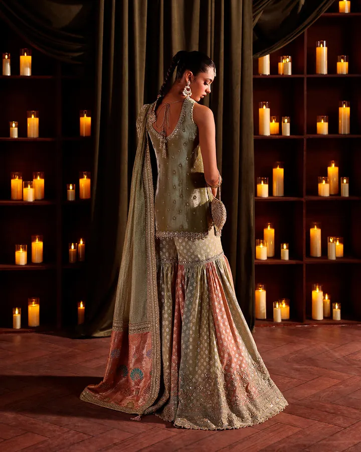 Showcasing a classic silhouette, Zerra mesmerizes with its eye-catching aesthetics. Â Crafted on a muted olive green, the velvet shirt features delicate patterns of dabka, sequins and cutdana. Paired with a voluminous, embroidered karandi gharara, embroidered zari net dupatta and an embroidered chiffon dupatta, this set is truly one-of-a-kind that will ensure you shine at all your festive events.