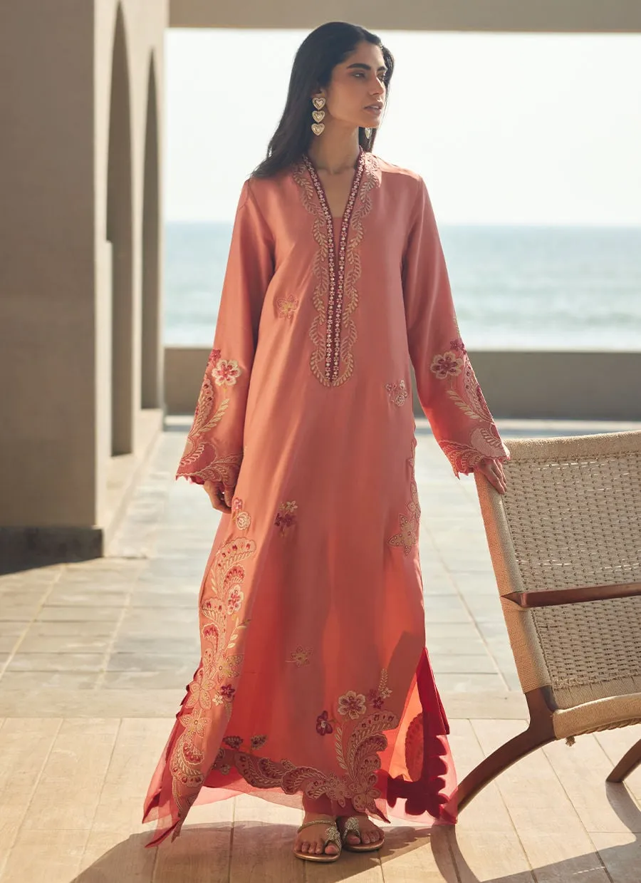 Bask in the soft charm of subtle sophistication with this softly luminous ensemble in a gorgeous coral hue. Crafted from sumptuous raw silk, the long, ankle-skimming shirt features full sleeves and short side slits, adorned with intricate embroidery in a vibrant palette. Thoughtfully placed embroidery graces the neckline, sleeves, and hemline, while scattered floral motifs lend a harmonious touch of elegance. A romantic, graceful outfit ideal for daytime festivities, intimate gatherings, or evening soirées.