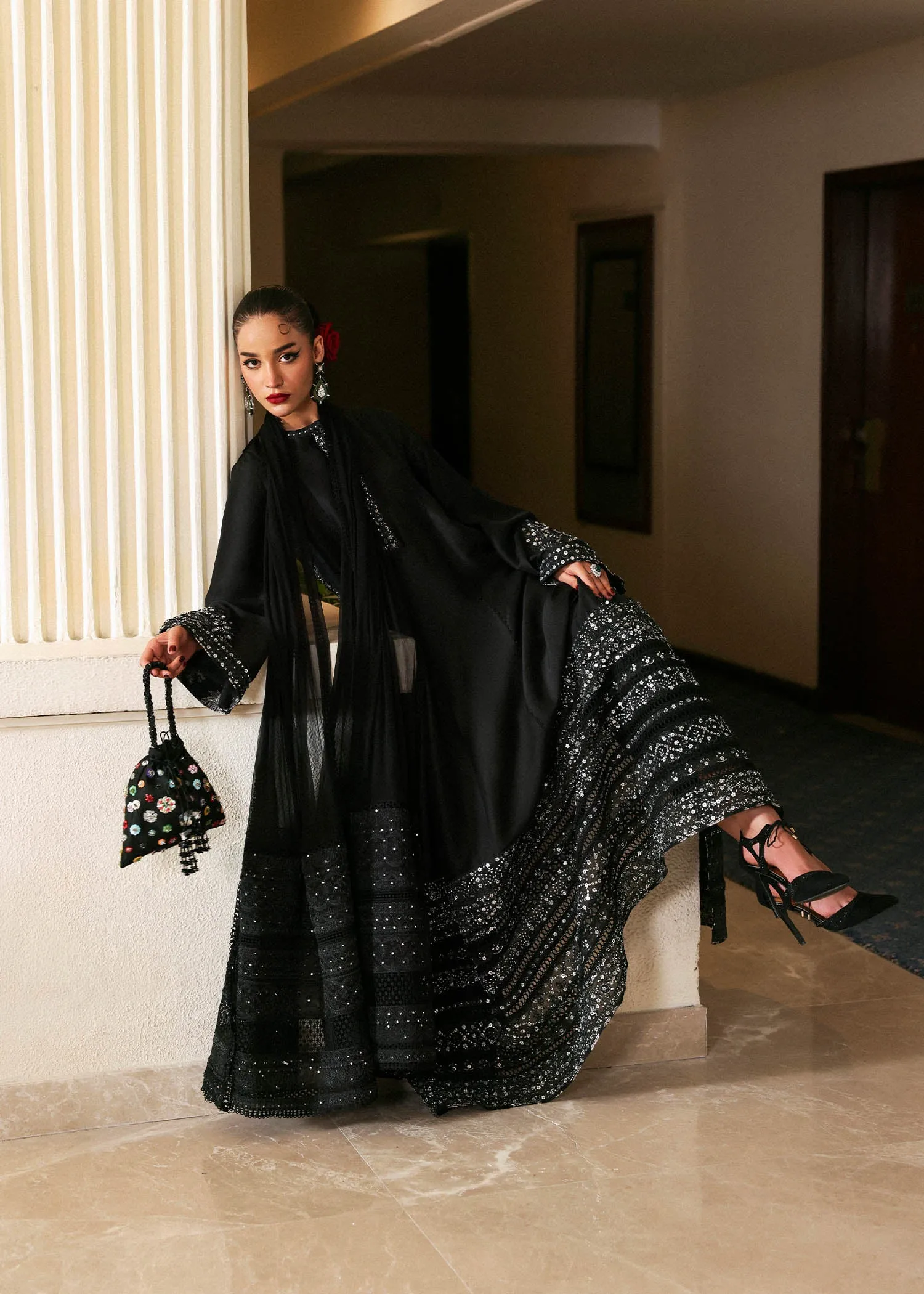 A pure raw silk black ankle-length paneled shirt, detailed with tonal embroidery, subtle pani work, and silver embellishments along the neckline, sleeves, seams, and hem. Layered organza borders with fine insert lace add quiet dimension. Paired with a chiffon dupatta edged in embroidered organza and lace trims, and straight cigarette pants for a polished finish.