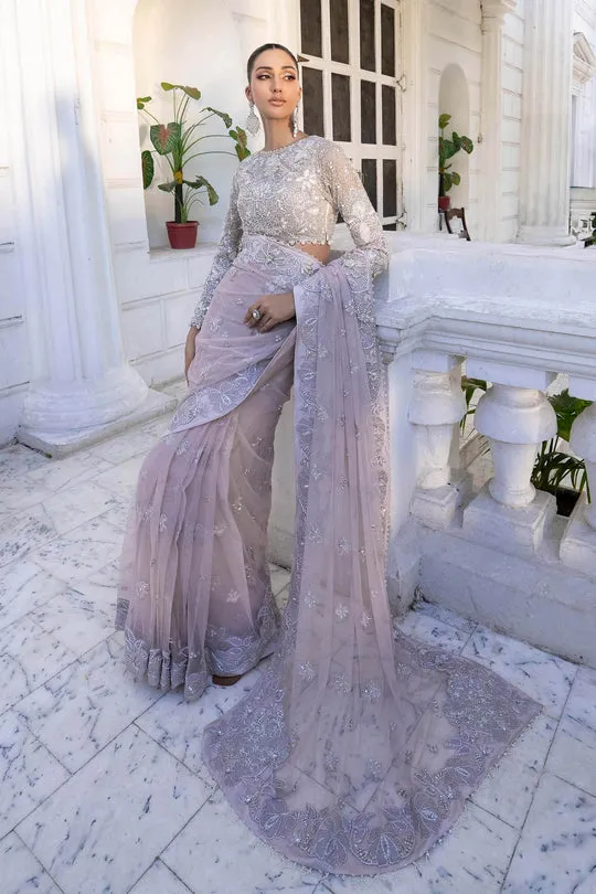 Lilac Garden Dream. This ethereal lilac saree blooms with bold, enchanting floral patterns. The intricate craftsmanship featuring scrolls, diamantes, bethki, and pearls is elevated by traditional dori and gotta work. An opulent masterpiece that’s pure magic.