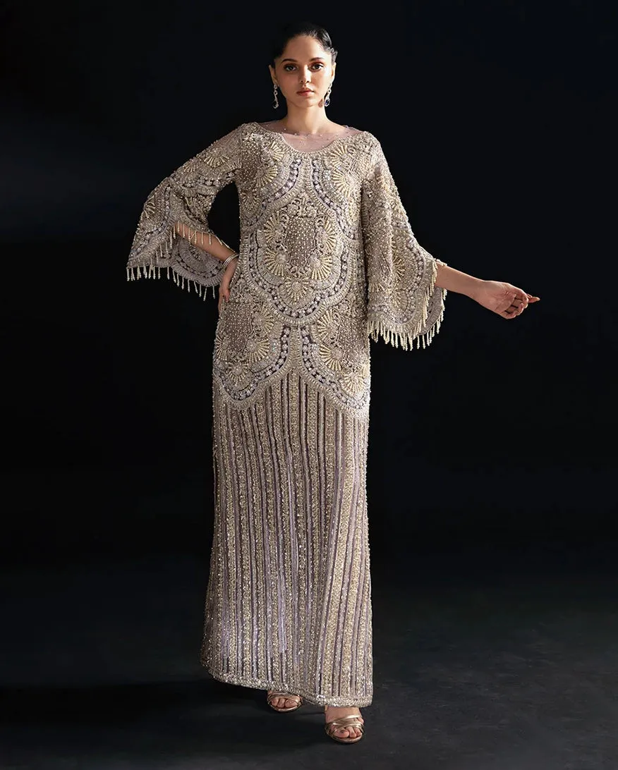 Crafted from a delicate net canvas in a soft lilac hue, Nuru is adorned with a symphony of luxurious details. Meticulously placed pearls, sparkling crystals, and intricate dabka embroidery grace the fabric, creating a captivating dance of textures and luminosity.