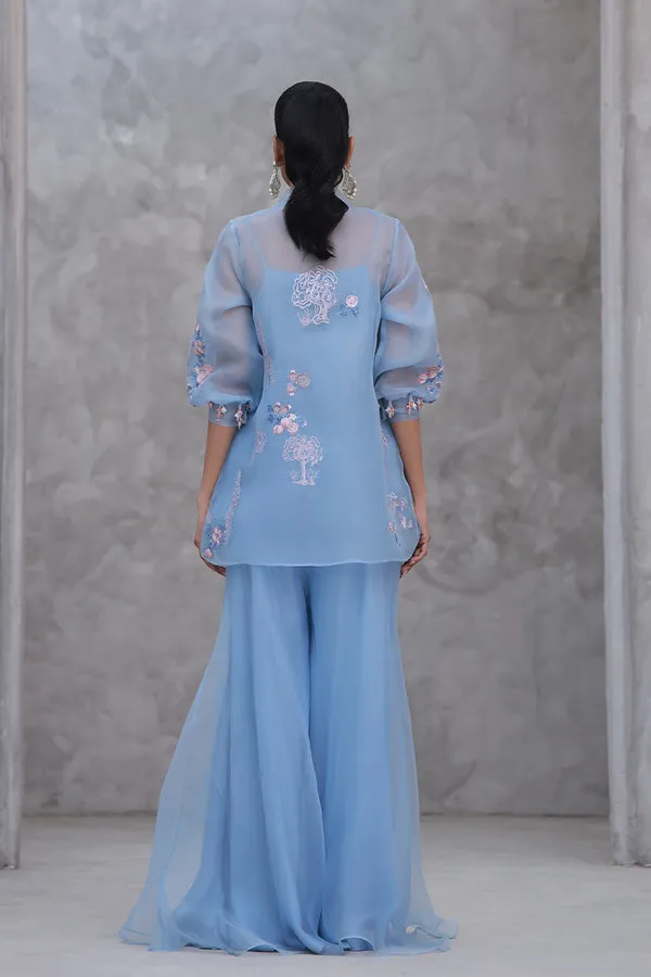 Sheer layers and a sweeping form give this cornflower blue ensemble its unhurried grace. The wispy organza jacket carries delicately embroidered botanicals, threaded in sparkling shades of pink and blue. Small clusters mark its length and subtle balloon sleeves with charming asymmetry. The soft glimmer of hand-beaded bow motifs on the front and sashaying tassels on the cuffs add a playful flutter to the look. A simple cotton silk camisole in matching cornflower blue layers underneath. Flared organza pants complete the ensemble, lending it movement and ease.