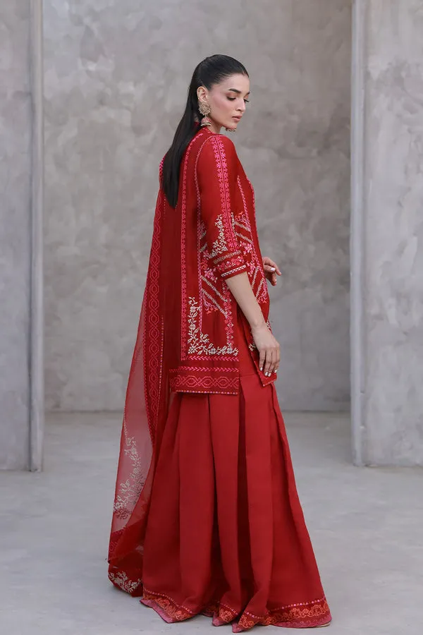 A bold hue carrying refinement and restraint. Rich red kora becomes the canvas of the short kameez, etched with tonal and beige threads blooming in cross-stitched strokes. A play of order and asymmetry creates more interest. Paired with a voluminous red khaddi silk gharara, the silhouette gains movement and ceremony. A red organza dupatta completes the ensemble, edged on all four sides with a geometric embroidered border that frames floral motifs echoing the kameez. A striking yet considered look for festive dinners and evening celebrations.