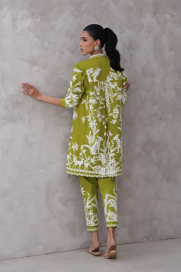 Print-led and refreshingly playful, this chartreuse cotton set brings a zing to everyday wear. The tunic features jungle-inspired screen prints, where botanicals intertwine with animal motifs across the body and balloon sleeves in off-white. Paired with matching cigarette pants, screen-printed with blooming sprigs shooting from the hem. A polished yet spirited choice for days that call for color and comfort.
