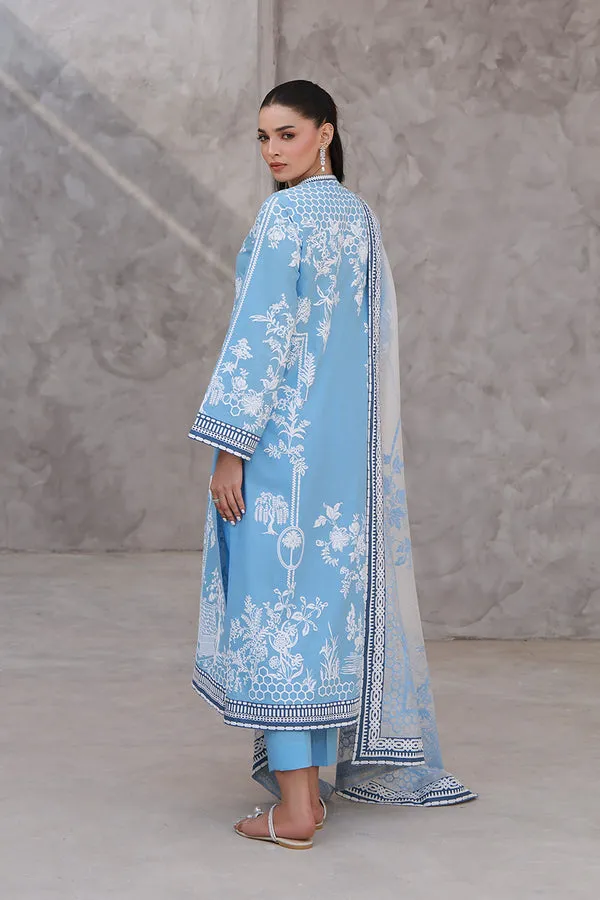 A calm blue, sharpened through contrast and screen prints. Shaped from breathable cotton, the straight-cut kameez is adorned with off-white botanical and chinoiserie motifs. Screen-printed across the length and sleeves, the intricate motifs embellish without overcrowding. Dark blue trim, screen-printed as well, lines the neckline, cuffs, and hem. Paired with solid straight pants in the same blue cotton, and finished with a white cotton net dupatta that echoes the screen-printed story in blue,