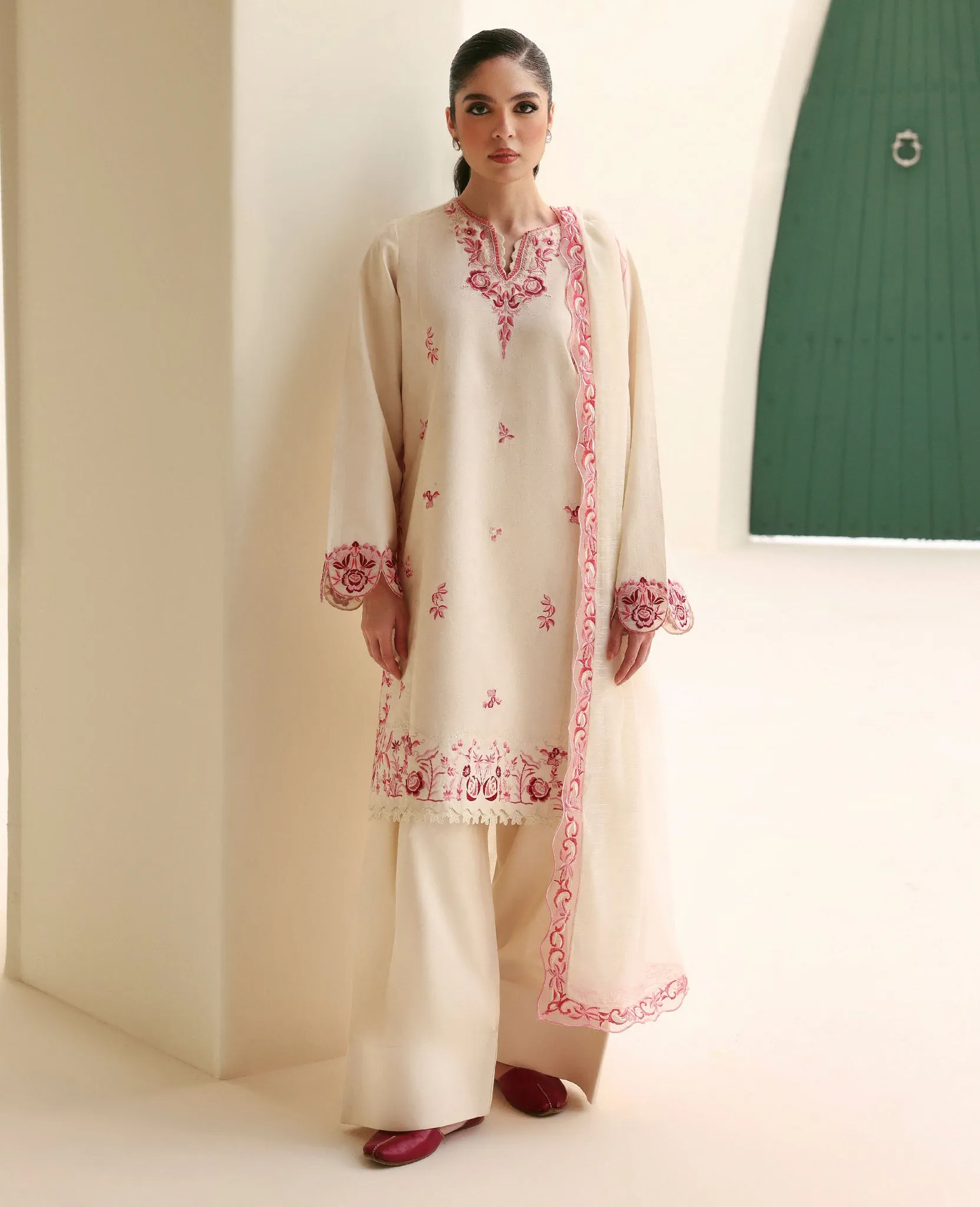 A short-length structured shirt crafted in self-jacquard, adorned with exquisite Parsigara embroidery in coral red on a pristine white base. The embroidered sleeves add a touch of refined detailing, enhancing the graceful appeal of the ensemble. Paired with a traditional farshi shalwar for an elegant silhouette and complemented by a slub monar dupatta featuring a 4-sided Parsigara embroidered border on a color-blocked light coral base, Camélia beautifully blends timeless tradition with contemporary finesse.