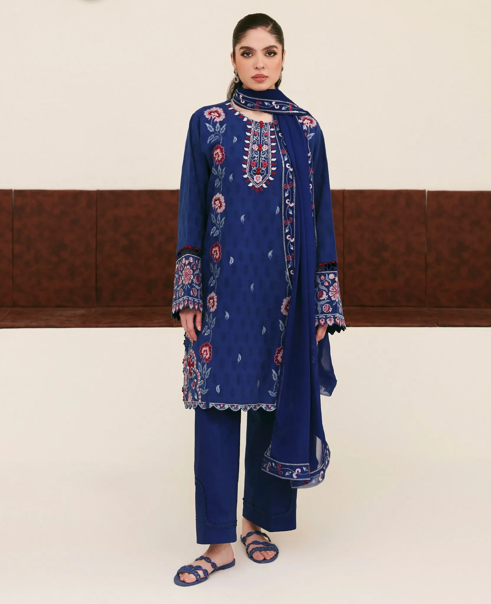 A mid-length Suzani shirt in a rich Persian blue hue, adorned with intricate Suzani embroidery in tones of red and coral. The neckline and sleeve borders are beautifully detailed with embroidery and delicate lace, adding a refined feminine touch. Paired with a chiffon dupatta featuring 4-sided embroidered borders and a plain trouser finished with lace detailing, Perle embodies elegance and timeless craftsmanship.
