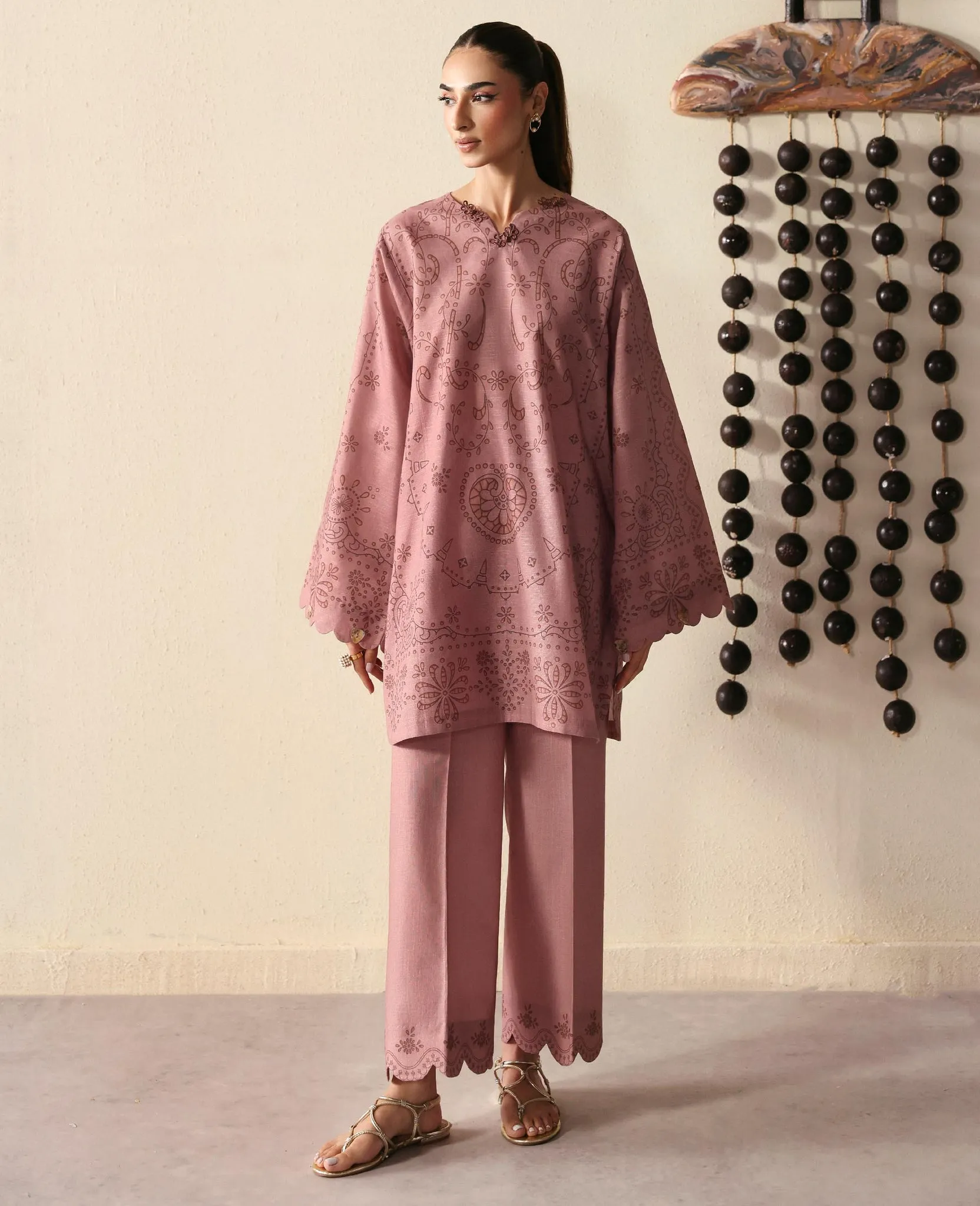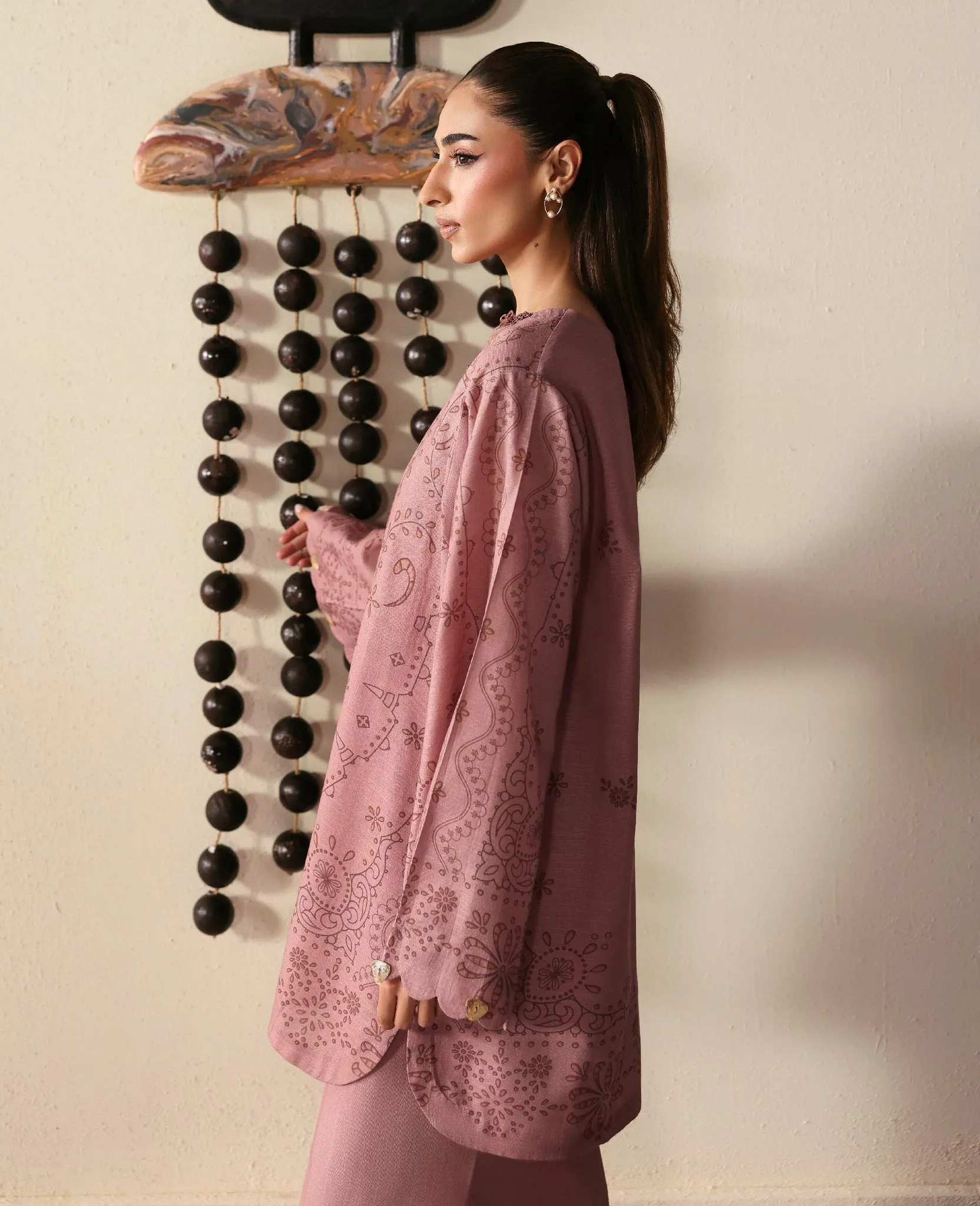A powder pink shirt featuring a composed print on the front, paired with matching trousers that have subtle wavy prints along the hem. The soft, monochromatic tones create a gentle and serene look, exuding understated elegance.