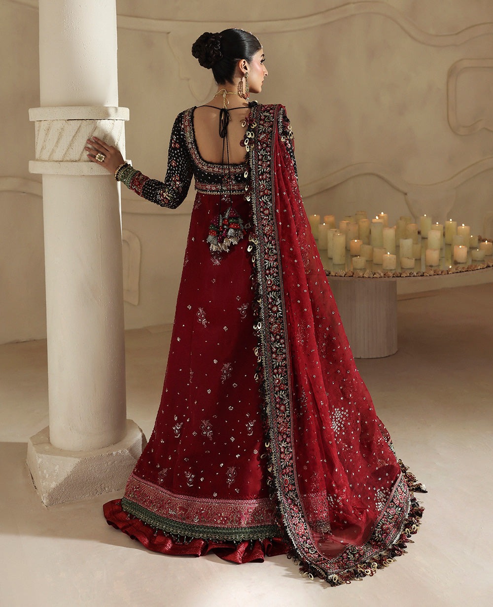 A symphony of bold elegance and timeless craft this organza paneled masterpiece enchants with its striking contrasts. The structured black bodice blooms with vibrant, hand embroidered florals melting seamlessly into rich red organza panels adorned with silver motifs and sequins that glimmer like stardust. Lush green and hot pink borders frame the design with playful sophistication, while the organza dupatta softly shimmering with scattered sequins adds a veil of mystery. Finished with a black embroidered border, it becomes a portrait of refinement, artistry and allure. A true celebration of modern glamour rooted in heritage.
