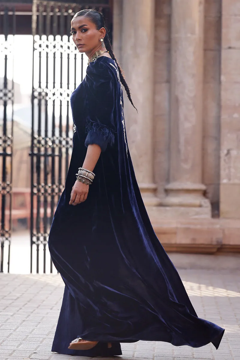 An elegant symmetrical shirt crafted in luxurious pure velvet, paired with pleated culottes for a refined, contemporary look. The shirt features exquisite silver appliqué detailing, complemented by silver and gold zari embroidery, lorix, and resham work on the back, creating a harmonious blend of texture and shine. Fur and feather accents along the sleeve edges add a touch of opulence and modern flair. The belted silhouette enhances the form, making this ensemble a perfect balance of structure and sophistication.
