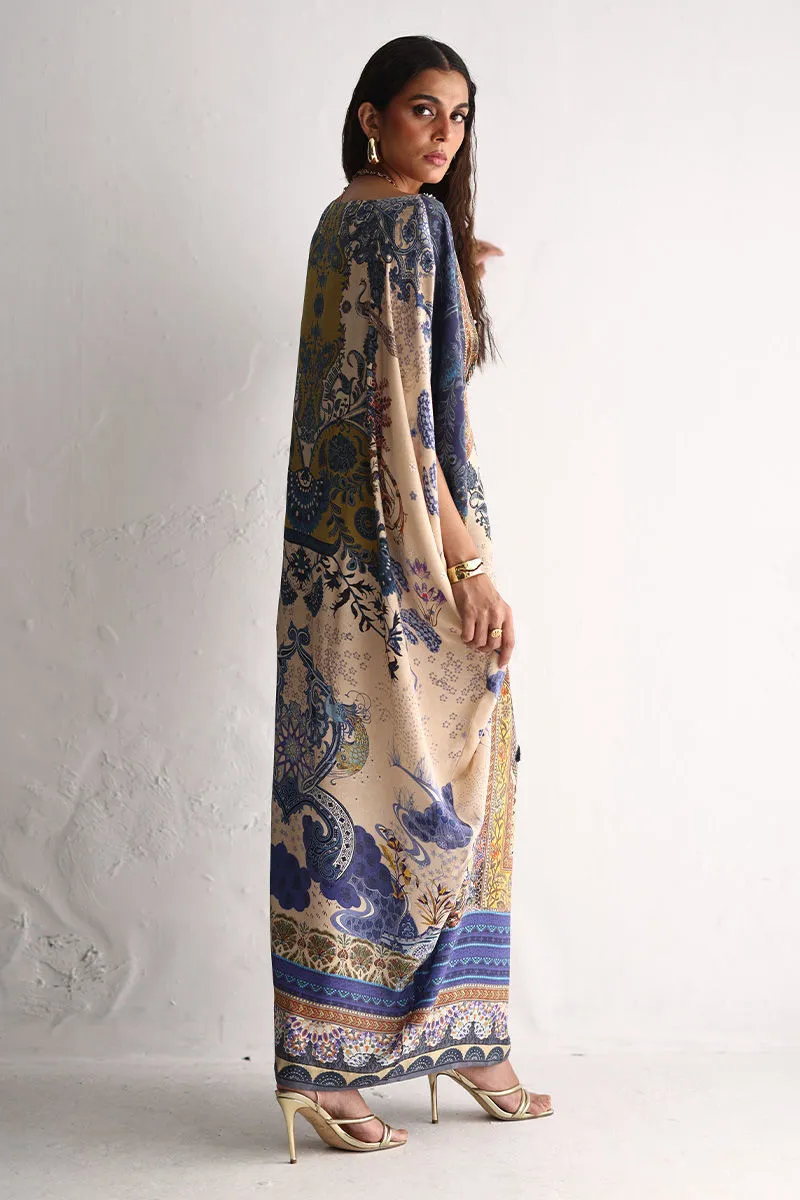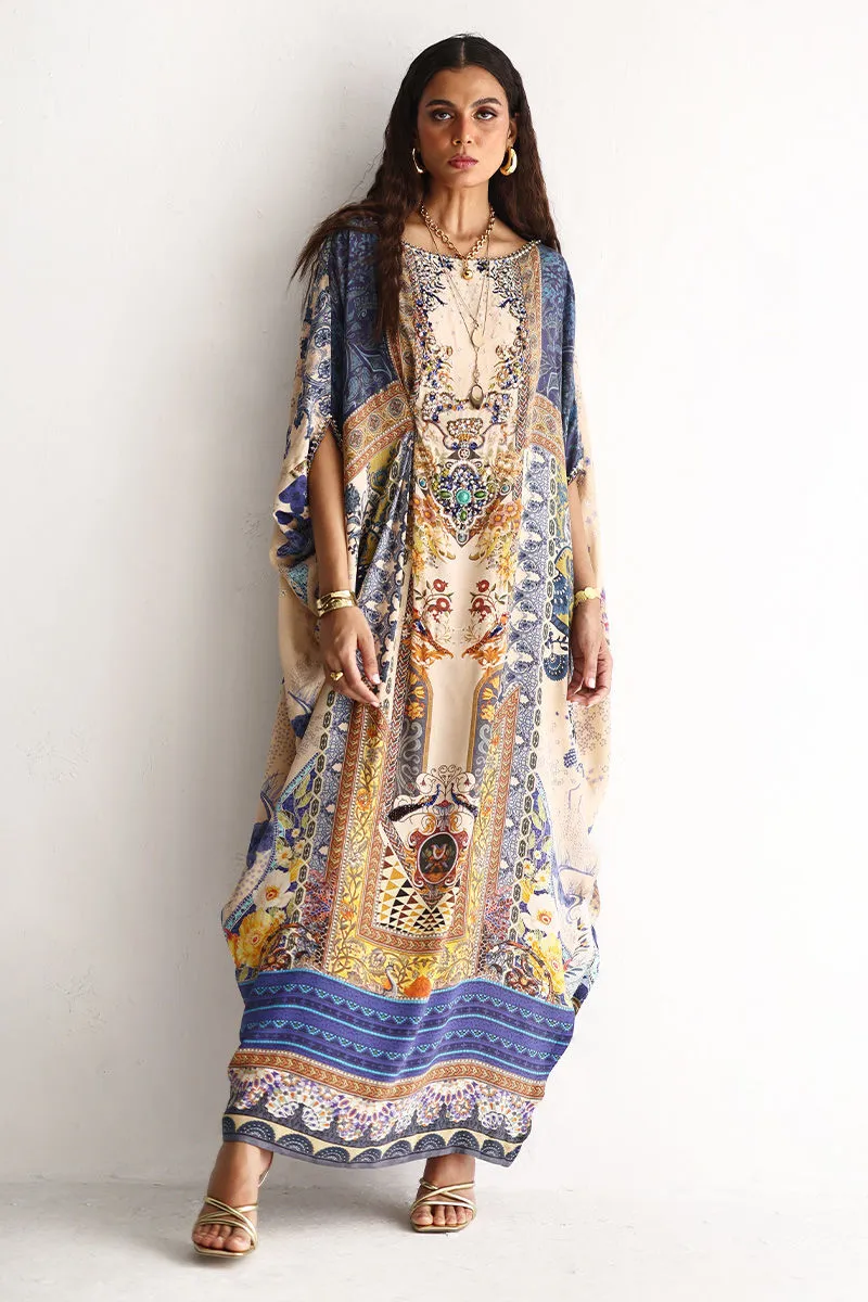 A graceful kaftan designed to make an effortless statement. Featuring digital print with embellishment of imported colored stones, textured stones, cutdana, sequins, pearls, and crystals, the design adds depth, texture, and a refined shimmer. Thoughtfully crafted for elevated festive dressing, this kaftan balances comfort with understated luxury, making it perfect for both day and evening occasions.