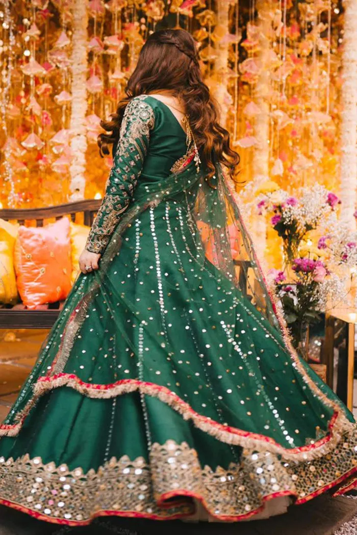 Emerald green raw silk lehnga choli with a thick embroidered border makes a complete pair with makaish dupatta. This article is hand embellished with tila, dori and sheesha.
