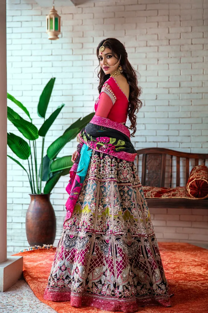 Organza lehenga with embroidered patchwork and border. Hand embellished with pearls, sequins, crystals and naqshi.