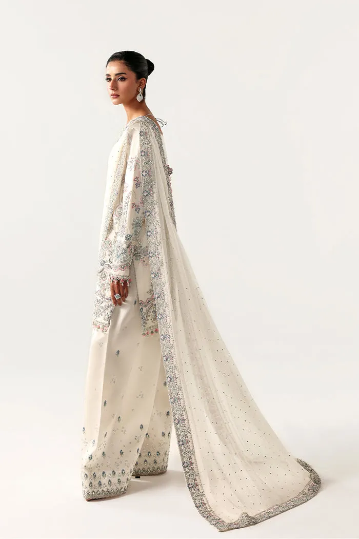 DESCRIPTION: A graceful creation from Saira Rizwan, this all-white ensemble features a silk short shirt paired with a classic shalwar. Intricately adorned with silver and white embellishment accented by delicate blue and pink detailing throughout, and along the borders of the chiffon dupatta. The dupatta drapes beautifully, completing this three-piece stitched outfit with timeless elegance and effortless charm.