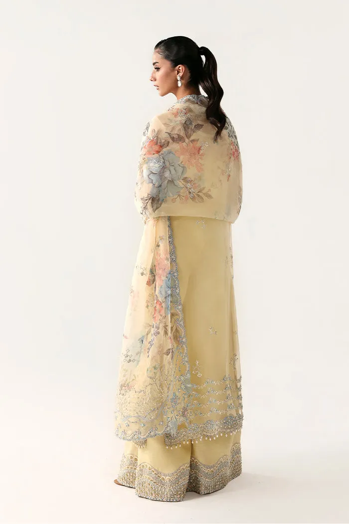 DESCRIPTION: A delicate creation from Saira Rizwan, this butter yellow ensemble is a graceful play of texture and translucency. A butter yellow top and matching trousers, the look is layered with a long organza shirt adorned with intricate silver, white, and light blue embellishment and embroidery throughout. The printed organza dupatta adds a soft, ethereal finish, completing this three-piece stitched outfit with understated elegance and modern sophistication. Cut out detailing in the neckline.