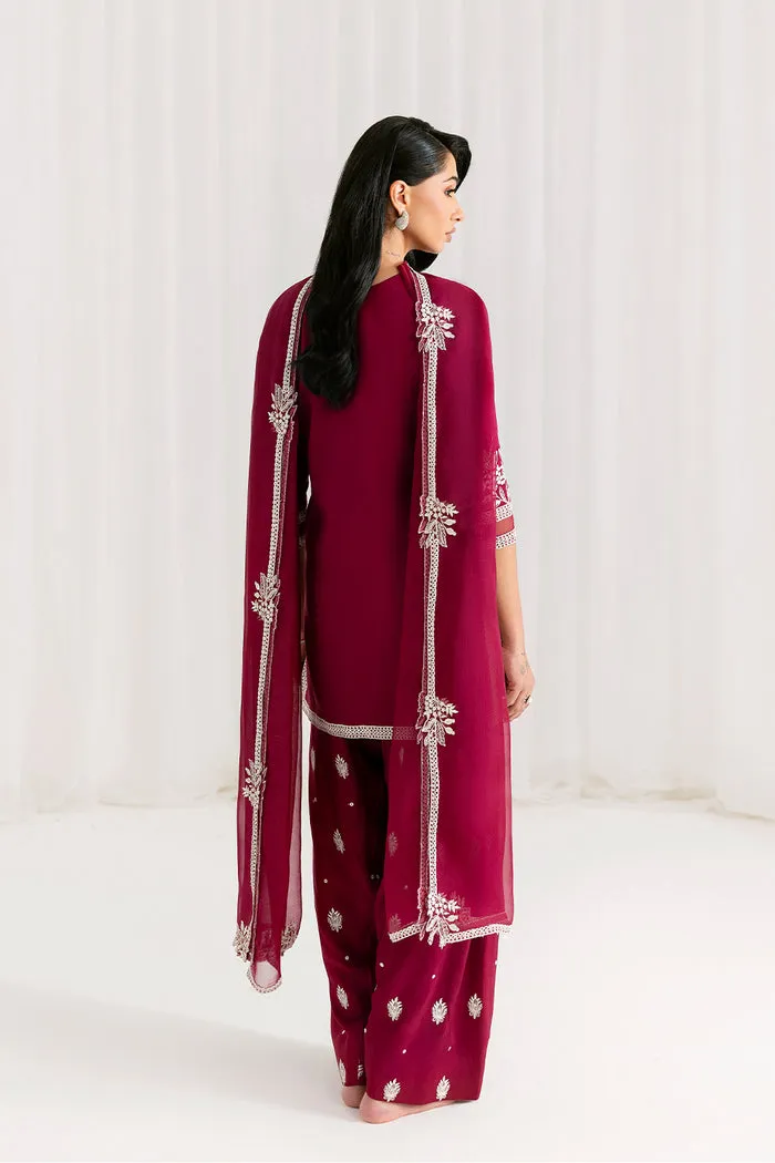 A graceful three-piece outfit featuring a Korean raw silk shirt with intricate Rashem thread embroidery and organza patch detailing. Paired with a pure embroidered organza dupatta and matching embroidered silk shalwar, this look blends elegance with timeless charm.