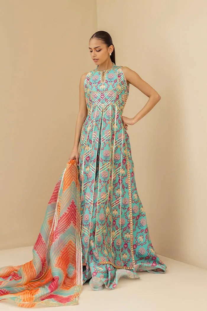 In a deep powder blue hue with hints of blush, lavender and hot pink this sleeveless, front open peshwas is cut from a featherlight khaddi silk that moves with ease. The flowing silhouette features a delicate print elevated with gota details and an embroidered bodice with subtle keyhole neckline. A multi hued organza dupatta with gota borders lends to the romanticism of the ensemble. Paired with matching cascading flared pants cut from khaddi silk, complementing the front open silhouette effortlessly.