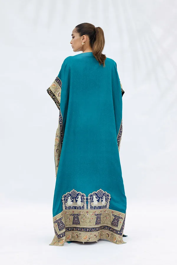 A jewel toned silhouette cut from lustrous teal self jamawar, this kaftan comes alive with intricate embroidery, where gilded vines entwine with burnished florals and the neckline is traced with ornamental detailing. Wide, stately drop shoulders flow into borders rich with decadent motifs that evoke palatial grandeur, while the hem is anchored by ornate, story like panels reminiscent of miniature paintings. A singular statement piece, it carries its own quiet drama through layered embellishment and sweeping design.