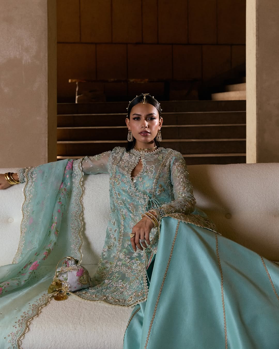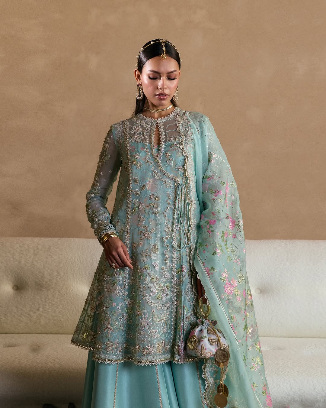 In serene aquamarine, this four-piece look exudes refined elegance. The organza paneled angharaka peplum features a keyhole neckline with tassels, lace accents, and sequin edging over a floral print silk slip. Paired with raw silk paneled sharara pants and a matching organza dupatta with scalloped borders, screen print, and tasselled paan patta motifs, the ensemble is a vision of grace.