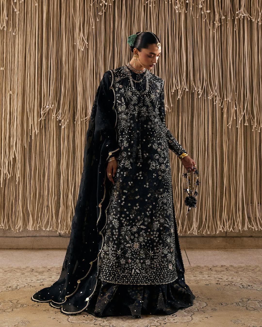 In deep coal black, this three-piece set features a raw silk printed straight shirt with embroidered detailing around the crew neckline and organza patching. Accented with lace extending to fitted sleeves that widen at the shoulders for a capped look, finished with gold tassels. Paired with matching raw silk gharara pants detailed with low lace and gold sequin spray. The organza dupatta completes the look with a scalloped border and gold sequin coin tassels.