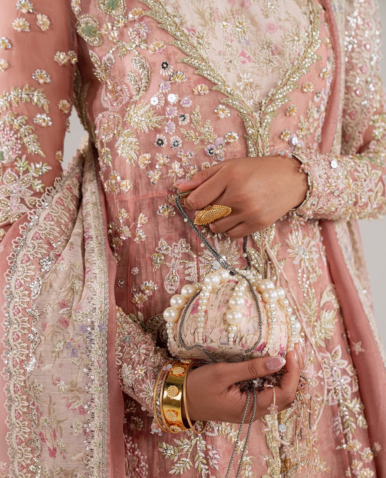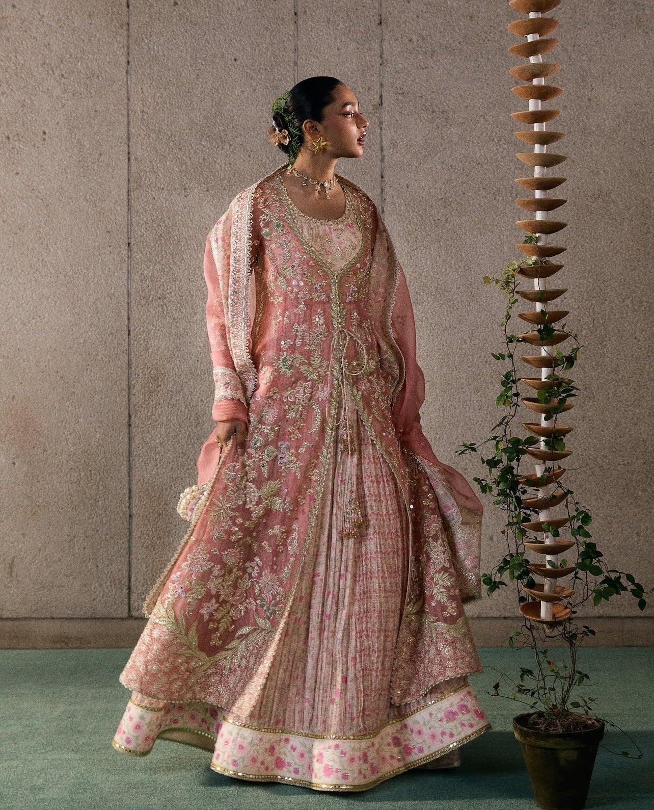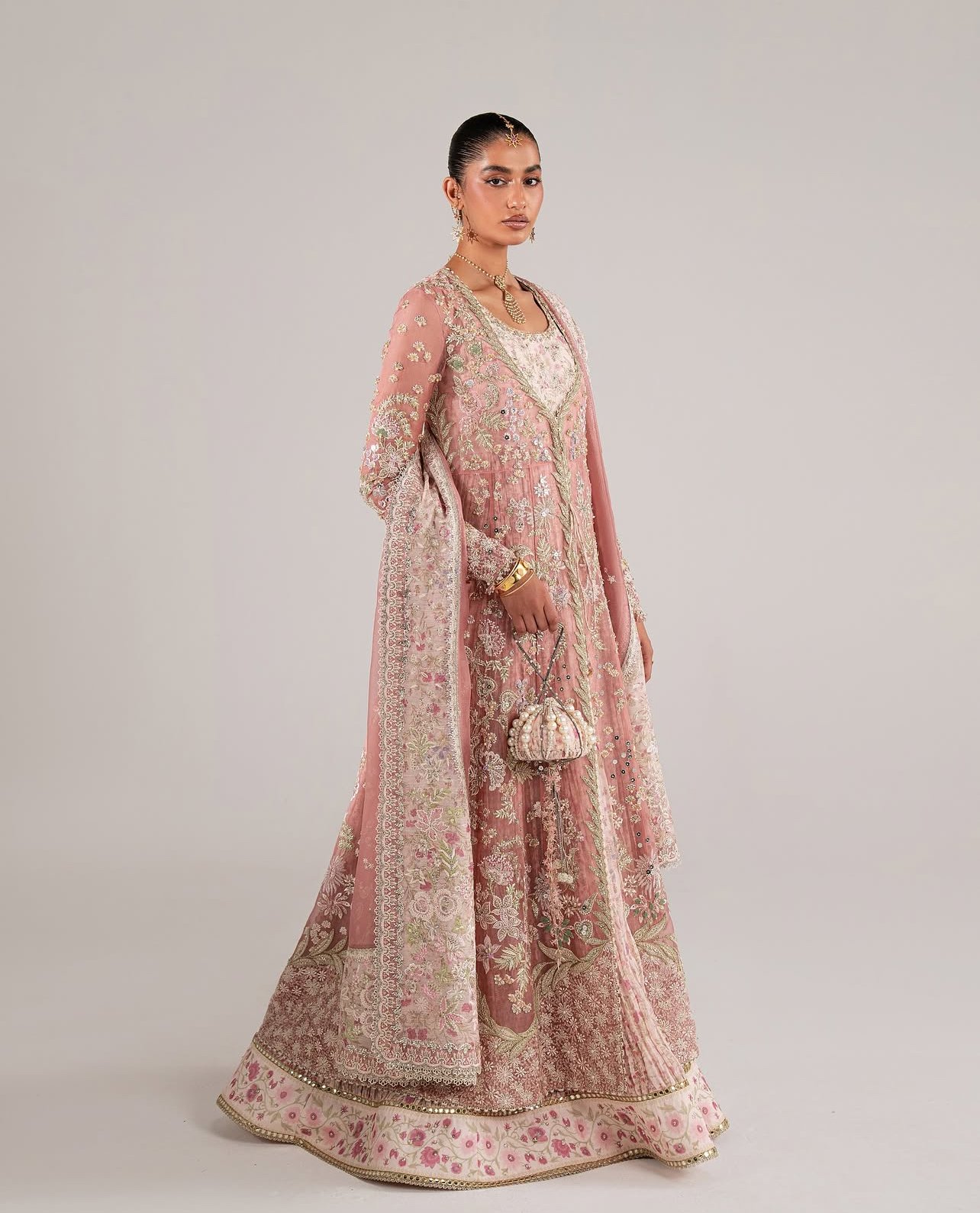 In a romantic blush rose hue, this four-piece design pairs a printed crushed pishwas with a heavily embroidered front-open organza jacket. Embellished with handwork in gold and silver, the overlay features tassel detailing at the front and a scooped V neckline framing the curved round neckline of the pishwas beneath. Full fitted sleeves with embroidery and tassels add refined elegance. Styled with matching printed sharara pants adorned with floral accents and detailed hems. The organza dupatta completes the look with printed borders that flow inward with delicate embroidery.