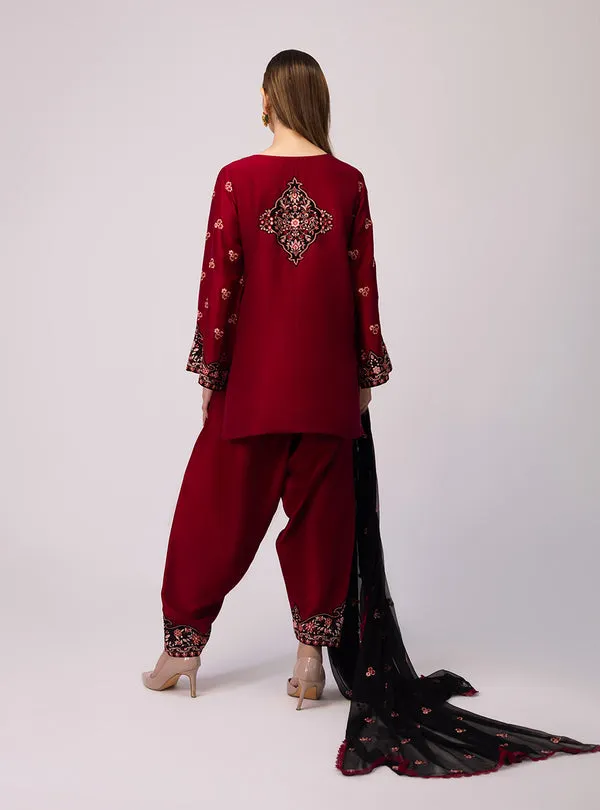 Ilaya, This beautiful three-piece outfit features a deep maroon raw silk short shirt with embroidery on the front, including a detailed V-neckline, embroidered sleeves, and a prominent hem design. It is paired with comfortable shalwar that have matching embroidered cuffs. The ensemble is completed with a black chiffon dupatta adorned with scattered embroidery, creating a sophisticated, stylish, and elegant look.