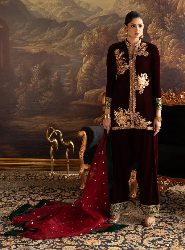 A magnificent three-piece ensemble that embodies festive grandeur. Crafted from sumptuously rich Maroon velvet, the exquisite short kurta is adorned with intricate gold tilla embroidery, forming an elaborate motif across the front and a breathtaking, sprawling design on the back. It is impeccably paired with matching flared velvet trousers, creating a sophisticated silhouette with a modern edge. The ensemble is completed by a sheer crimson organza dupatta, beautifully edged with a contrasting Emerald Green velvet border and subtly scattered with gold sequins, adding a final touch of regal charm.