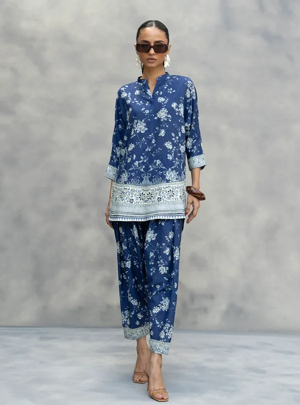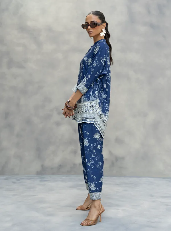 This indigo blue printed set is pure Sunday Reset vibes, effortlessly chic, ridiculously comfortable, and totally photogenic. Made from soft, cosy viscose, the print is a dreamy mix of white florals that feel both vintage and completely fresh. The relaxed-fit kurta and coordinating trousers give you that polished, long-line look. Finished with a beautiful white contrast trim, this is your go-to for turning a casual day out into a major style moment.