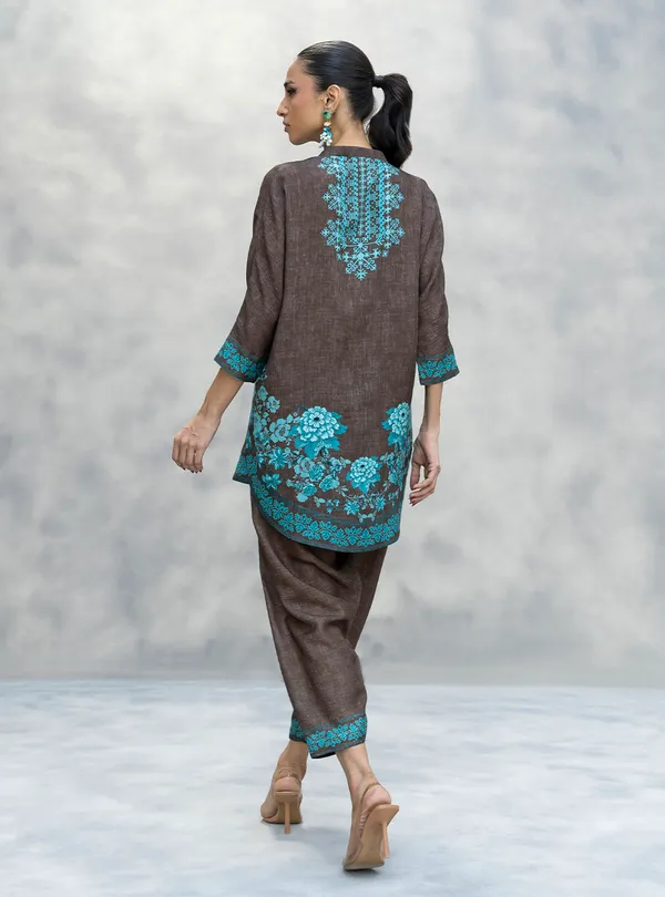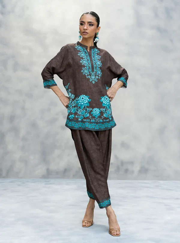 The rich, textured brown fabric provides the perfect canvas for the stunning, vibrant turquoise embroidery that covers the yoke, hem, and cuffs giving you a major Stitch Pop. The relaxed-fit kurta and comfortable, slouchy shalwar bottoms ensure you’re cozy all day, while the bold, contrasting pattern makes sure your Main Character Aura is set to high.