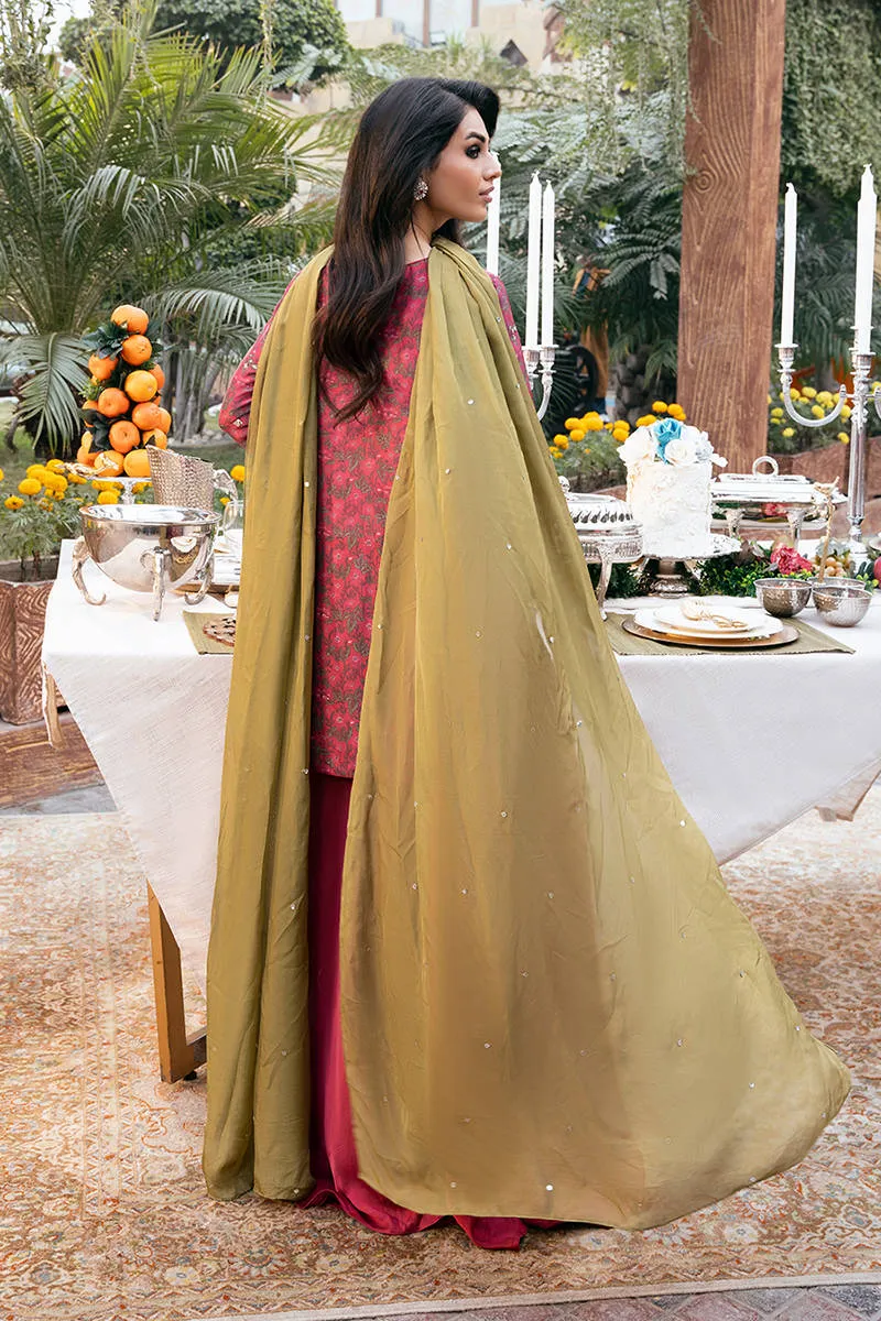 Digitally printed Short shirt crafted from pure raw silk, adorned with a delicate all-over floral. The shirt is further enhanced with subtle hand embellishments. It is paired with Satin silk flowy pants, designed to complement the look with their structured silhouette it. Completing the ensemble is a flowing KP SILK dupatta, draped effortlessly to add lightness and movement, beautifully balancing the richness of the silk textures.
