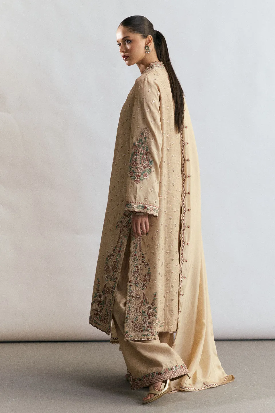 A beige raw silk ensemble that embodies quiet luxury with a festive undertone. The shirt features full-front embroidery with a captivating blend of sequin and resham detailing, lending a soft celebratory shimmer. Paired with loose-fit embroidered pants for a relaxed yet refined silhouette, the look is completed with a light silk dupatta finished with delicately embroidered borders—perfect for elegant festive gatherings.