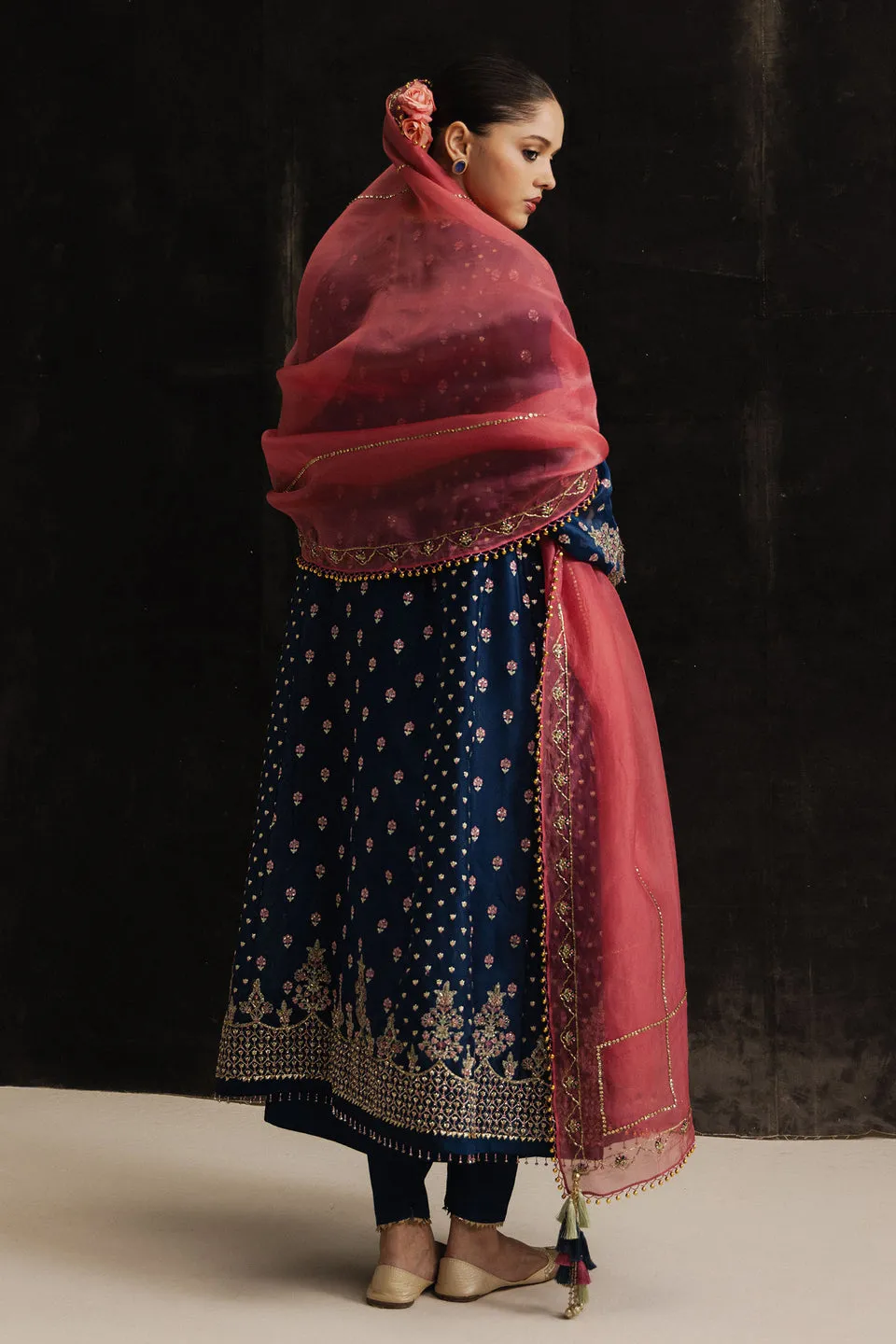 It is paired with a korean raw silk tapered shalwar, highlighted with subtle gotta accents. The look is completed with a pink pure organza dupatta, hand-embellished with ghungroo and tassel details, bringing movement, texture, and a hint of playful drama. Option of full underlining is available.